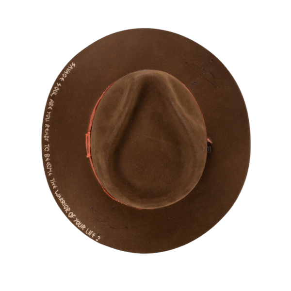Matéria-prima: YARA Hat fedora em suede que une luxo e vibração selvagem. As penas, com sua importância cultural nos rituais mesoamericanos, conferem autenticidade à moda contemporânea.