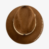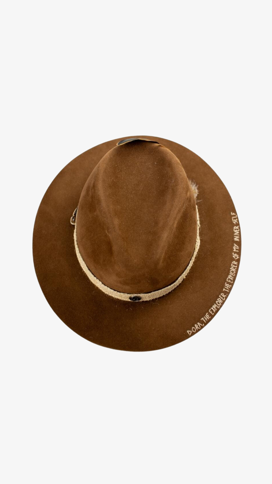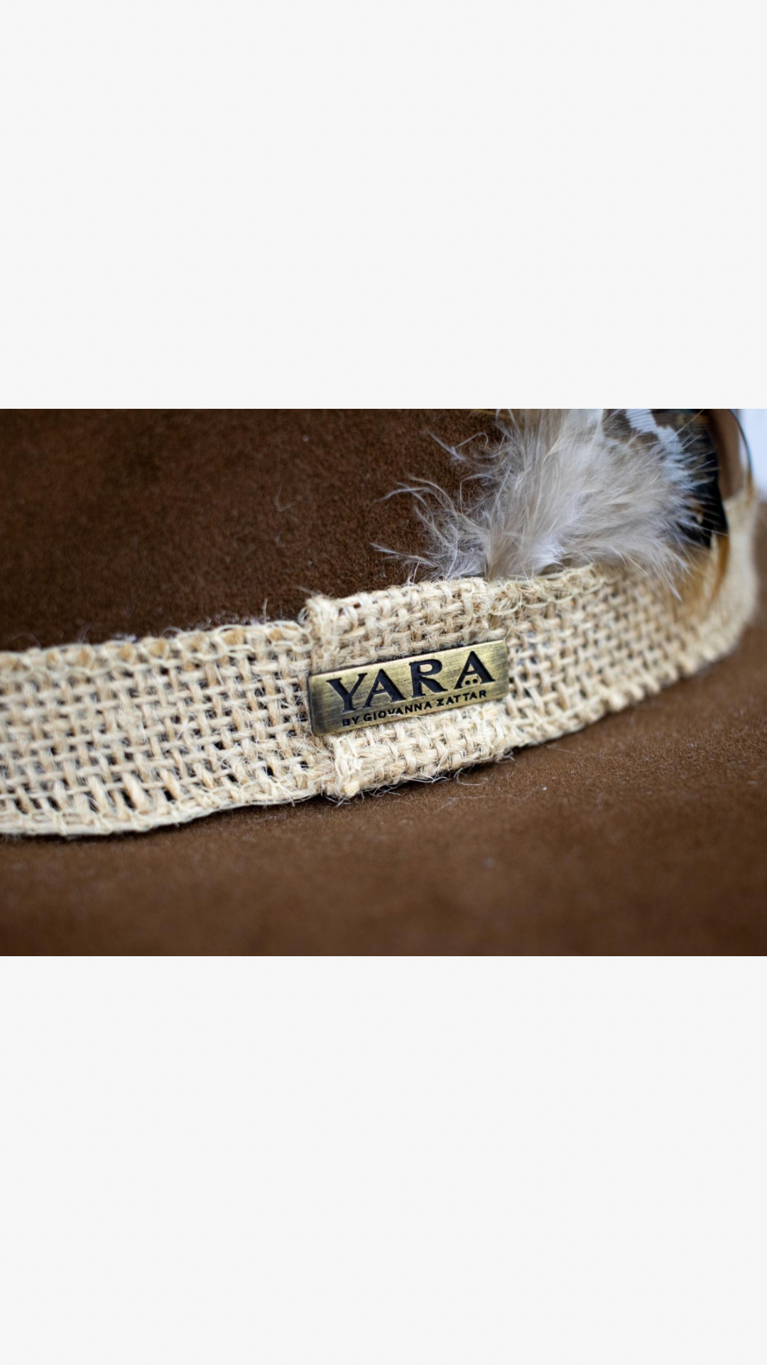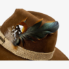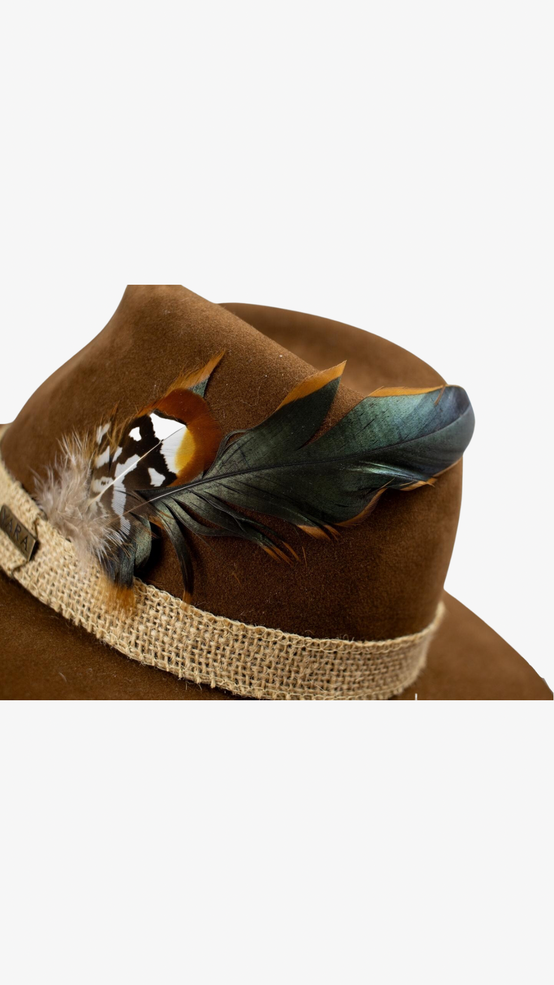 YARA Hat na cor caramelo, que traz penas e o cristal olho de Tigre, para simbolizar um arquétipo de coragem e espírito explorador.