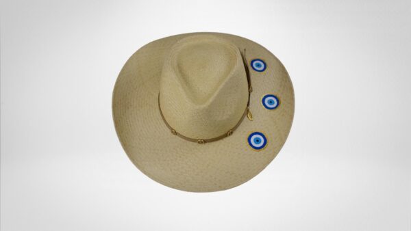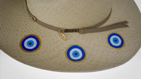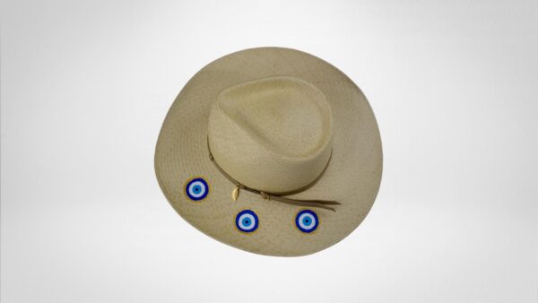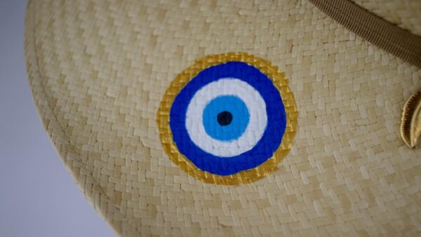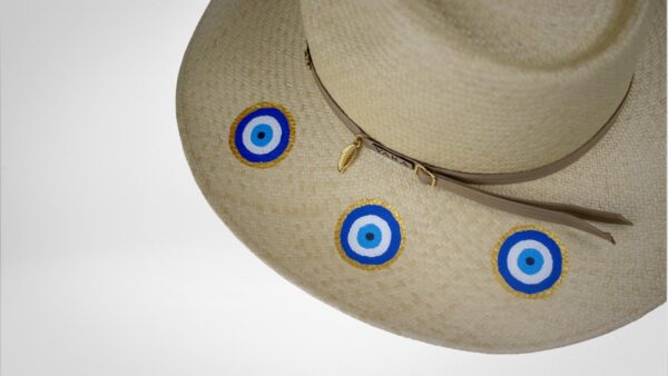 Milos, com suas águas cristalinas e paisagens deslumbrantes, é uma joia das Cíclades. Este chapéu Panamá legítimo, adornado com um olho grego pintado à mão, complementa perfeitamente o cenário da ilha.